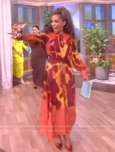 Sunny Hostin on The View on ABC was spotted wearing this orange tie dye dress on The View on Mar 25 2024's episode. Sunny's Dress is the Peirene Dyed Maxi Dress by Altuzarra.