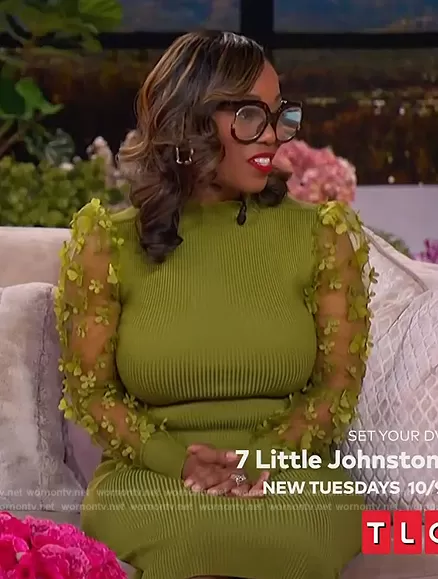 on The Jennifer Hudson Show on FOX was spotted wearing this olive lace sleeve sweater dress on The Jennifer Hudson Show on Mar 18 2024's episode. 's Dress is the Sheer Luck Sweater Midi Dress by Fashion Nova.