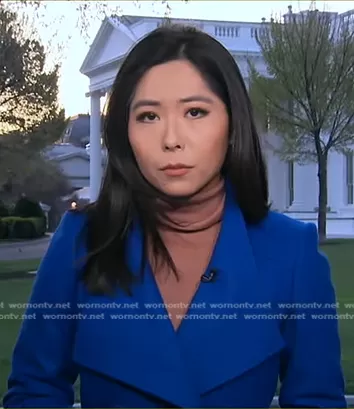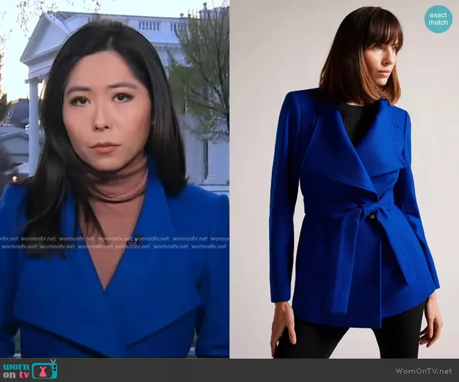 on Good Morning America on ABC was spotted wearing this blue wrap coat on Good Morning America on Mar 26 2024's episode. 's Coat is the Rytaa Short Wool Wrap Coat in Blue by Ted Baker.