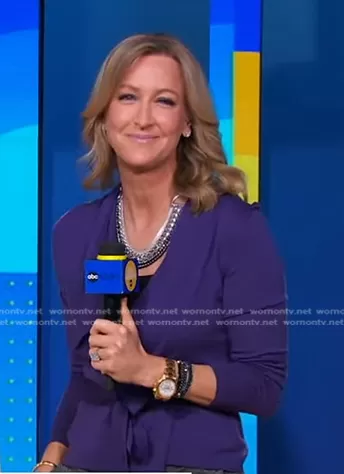 Lara Spencer on Good Morning America on ABC was spotted wearing this purple wrap top on Good Morning America on Mar 26 2024's episode. Lara's Top is the Wool Belted Cardigan by Elie Tahari.