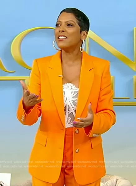 Tamron Hall on Tamron Hall Show on ABC was spotted wearing this white lace bustier top and blazer on Tamron Hall Show on Mar 26 2024's episode. Tamron's Top is the Grosgrain-trimmed lace bustier top by Dolce & Gabbana . Tamron's Blazer is the Iconic Regular Blazer Jacket by Stella McCartney . Tamron's Pants is the Cropped Pleated Trousers by Stella McCartney.