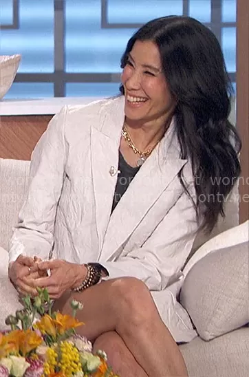 on The Talk on CBS was spotted wearing this white crinkled leather blazer on The Talk on Mar 26 2024's episode. 's Jacket is the Visko Crinkled Leather Blazer by Zadig & Voltaire.