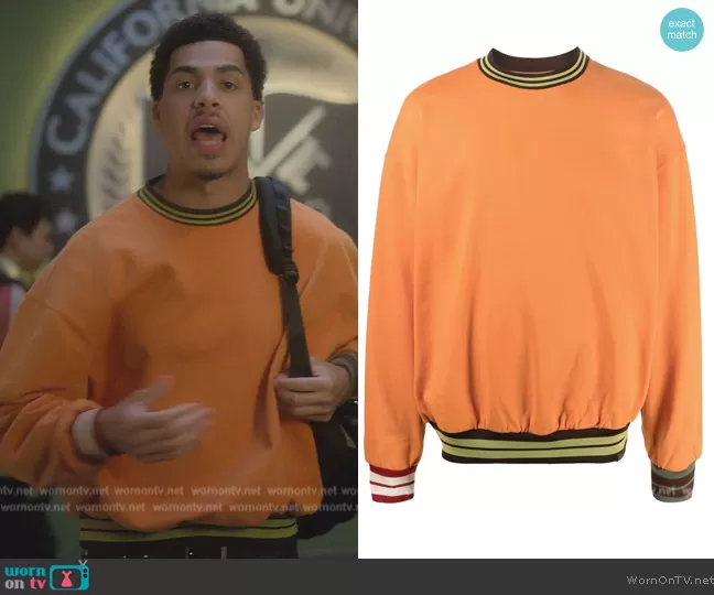 Andre Johnson, Jr. (played by Marcus Scribner) on Grown-ish on Freeform was spotted wearing this orange sweater on Grown-ish on episode 'Hussle & Motivate' (6x10) in Mar 2024. Junior's Sweater is the Le Lasso stripe-trim sweatshirt by Jacquemus.