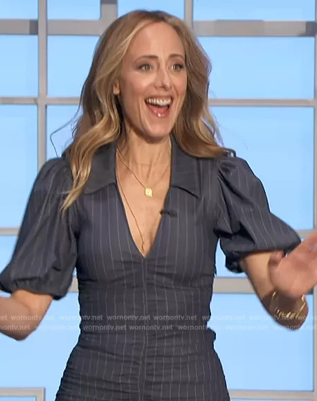 on The Talk on CBS was spotted wearing this pinstripe ruched dress on The Talk on Mar 27 2024's episode. 's Dress is the Stretch Pinstripe A-Line Dress by Ganni.