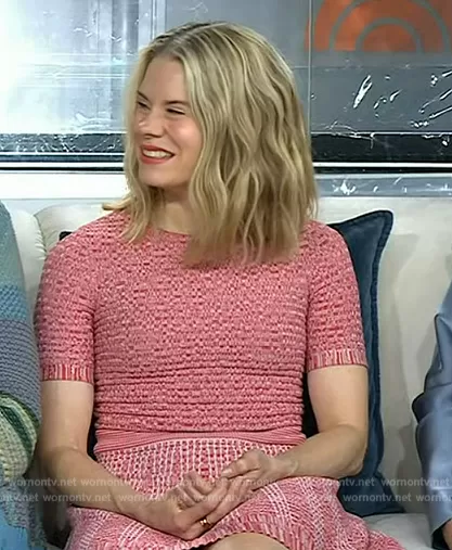 on Today on NBC was spotted wearing this pink tweed dress on Today on Mar 29 2024's episode. 's Dress is the Pink Heath Knit Jacquard Mini Dress by Shoshanna.