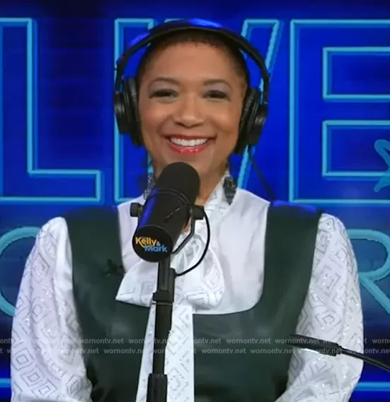 Deja Vu on Live with Kelly and Mark on Disney ABC Home Entertainment was spotted wearing this green leather dress on Live with Kelly and Mark on episode 'Reunion' (8x19) in Apr 2024. Deja Vu's Dress is the Side-Ruched Faux-Leather Sheath Dress by Guess.
