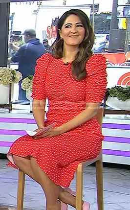 on Today on NBC was spotted wearing this red polka dot ruched dress on Today on Apr 01 2024's episode. 's Dress is the Ruched Dot Stretch Crepe Midi-Dress by Kate Spade.