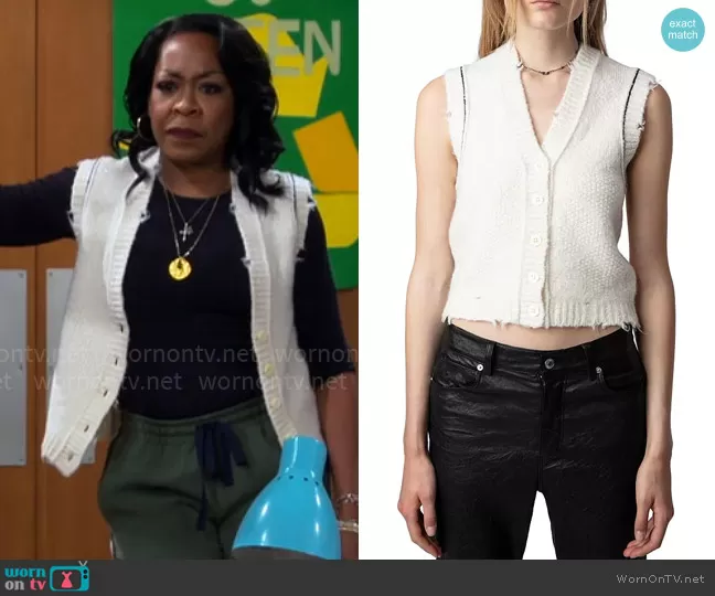 Tina Butler (played by Tichina Arnold) on The Neighborhood on CBS was spotted wearing this white sweater vest and green side stripe pants on The Neighborhood on episode 'Welcome to the Walkout' (6x06) in Apr 2024. Tina's Vest is the Karry Cardigan by Zadig & Voltaire . Tina's Pants is the Pomy Pants by Zadig & Voltaire.