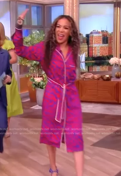 Sunny Hostin on The View on ABC was spotted wearing this red and blue printed shirtdress on The View on Apr 02 2024's episode. Sunny's Dress is the Doralas Abstract-Print Long-Sleeve Belted Shirtdress by Dries Van Noten.