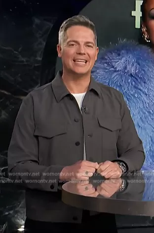 on E! News on E! was spotted wearing this gray button front shirt on E! News on Apr 02 2024's episode. 's Shirt is the Hazleton Zip Jacket by Theory.