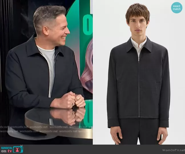 on E! News on E! was spotted wearing this gray zip front jacket on E! News on Nov 08 2024's episode. 's Jacket is the Hazelton Zip Jacket in Stretch Wool by Theory.