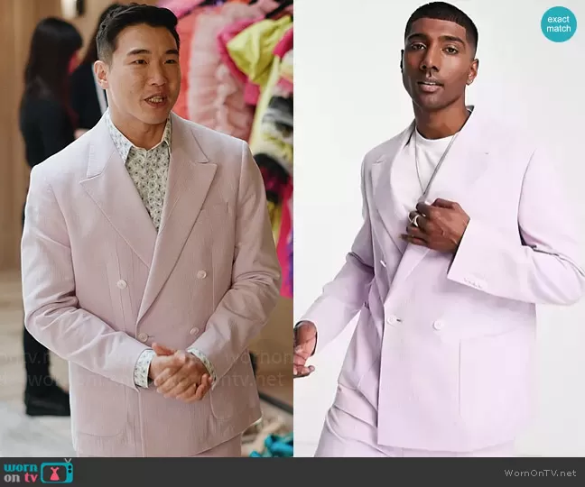 Nicholas (played by Joel Kim Booster) on Loot on Apple was spotted wearing this lilac suit on Loot on episode 'Slide' (3x09) in Dec 2025. Nicholas's Jacket is the Relaxed double breasted suit jacket in lilac crepe by Topman . Nicholas's Pants is the Slim suit pants in lilac crepe by Topman.