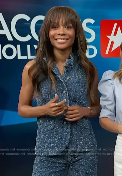 Zuri Hall on Access Hollywood on NBC was spotted wearing this denim splatter print vest and pants on Access Hollywood on Apr 02 2024's episode. Zuri's Vest is the Slade Textured Denim Vest by Rag and Bone . Zuri's Pants is the Logan High Rise Wide Leg Jeans in Midtweed by Rag and Bone.