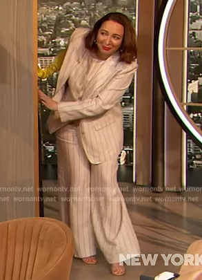 on The Drew Barrymore Show on CBS was spotted wearing this white pinstripe suit on The Drew Barrymore Show on Apr 01 2024's episode. 's Blazer is the Pinstripe Linen Peak Lapel Blazer by Lafayette 148 . 's Pants is the Pinstripe Linen Sullivan Pants by Lafayette 148.