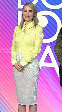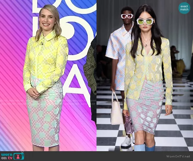 on Today on NBC was spotted wearing this Emma Roberts’ yellow floral shirt and skirt on Today on Apr 03 2024's episode. 's Outfit is the Spring 2024 Collection by Versace.