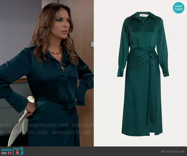 Natalia (played by Eva LaRue) on General Hospital on ABC was spotted wearing this green satin shirtdress on General Hospital on Apr 03 2024's episode. Natalia's Dress is the Samba Dress by Simkhai .