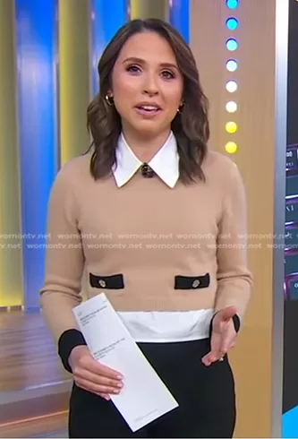 Elizabeth Schulze on Good Morning America on ABC was spotted wearing this beige mixed media sweater on Good Morning America on Apr 04 2024's episode. Elizabeth's Sweater is the Dale Mixed Media Wool & Cashmere Crop Sweater by Sandro.