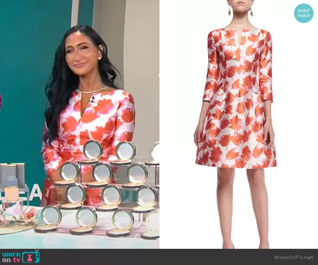 Elizabeth Werner on CBS Mornings on CBS was spotted wearing this red floral dress on CBS Mornings on Apr 04 2024's episode. Elizabeth's Dress is the 3/4-Sleeve Petal-Print Silk Dress by Oscar de la Renta .