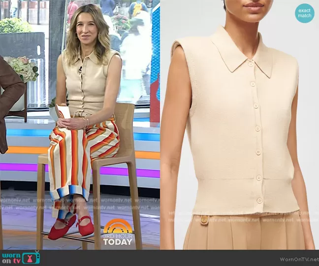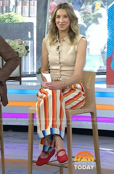 on Today on NBC was spotted wearing this beige vest and striped pants on Today on Apr 05 2024's episode. 's Vest is the Nola Sweater by Staud . 's Pants is the Tailored Relaxed Trouser Rosie Assoulin . 's Shoes is the Square-Toe Mary-Jane by Vivaia.