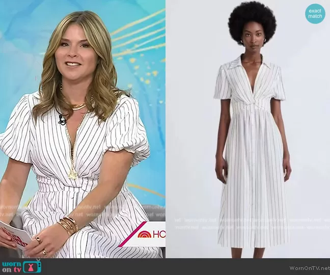 Jenna Bush Hager on Today on NBC was spotted wearing this white striped twist front dress on Today on Apr 05 2024's episode. Jenna's Dress is the Maya Stripe Linen & Cotton Twist-Front Dress by Derek Lam.