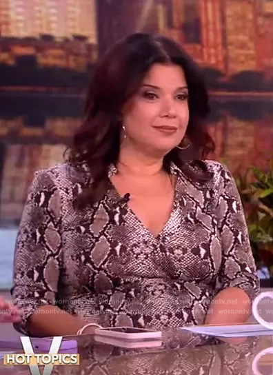 Ana Navarro on The View on ABC was spotted wearing this snake skin print wrap dress on The View on Apr 05 2024's episode. Ana's Dress is the Abigail Silk Jersey Maxi Wrap Dress by Diane von Furstenberg.