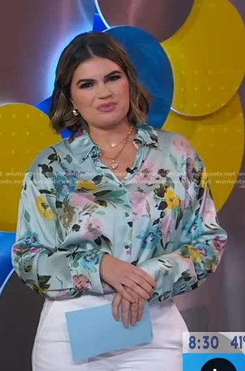on Good Morning America on ABC was spotted wearing this green floral blouse on Good Morning America on Apr 05 2024's episode. 's Top is the Floral Print Satin Shirt by Zara.