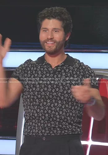 on The Voice on NBC was spotted wearing this black print polo shirt on The Voice on Apr 01 2024's episode. 's Shirt is the Robot-print Polo Shirt by Saint Laurent.