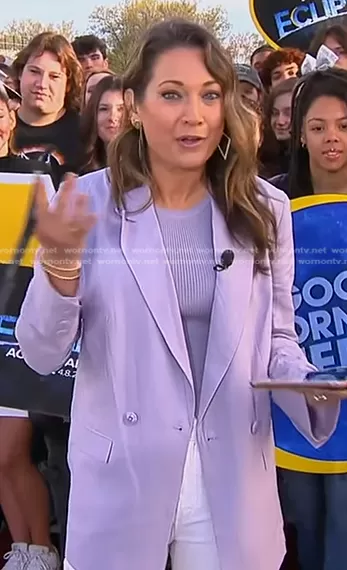 Ginger Zee on Good Morning America on ABC was spotted wearing this lilac top and blazer on Good Morning America on Apr 08 2024's episode. Ginger's Top is the Quarter Sleeve Ribbed Top by Naadam . Ginger's Jacket is the Linen Blazer by Thakoon Collective.