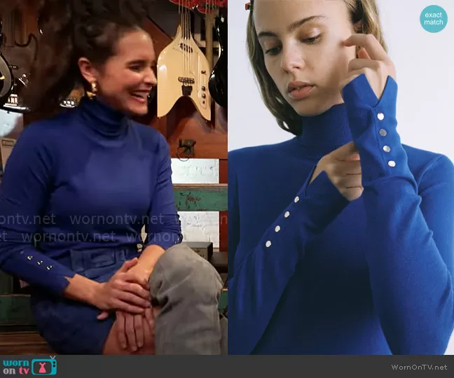 Lilia Luciano on CBS Mornings on CBS was spotted wearing this blue turtleneck and suede mini skirt on CBS Mornings on Apr 09 2024's episode. Lilia's Top is the Knit Turtleneck by Zara . Lilia's Skirt is the Gillie Skirt in Electric Blue by Sezane .