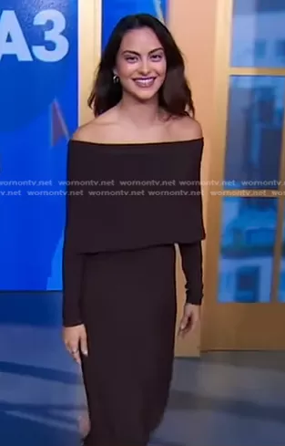 on Good Morning America on ABC was spotted wearing this brown off-shoulder dress on Good Morning America on Apr 03 2024's episode.
