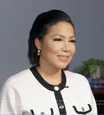 Stephanie Ramos on Good Morning America on ABC was spotted wearing this white contrast trim cardigan on Good Morning America on Apr 09 2024's episode. Stephanie's Sweater is the Murcie Flap Pocket Cardigan Sweater in ecru by Sandro.