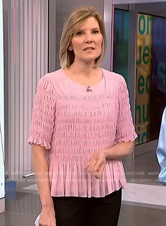 Kate Snow on NBC News Daily on NBC was spotted wearing this pink smocked top on NBC News Daily on Apr 09 2024's episode. Kate's Top is the Smocked Chiffon Top by Jason Wu.