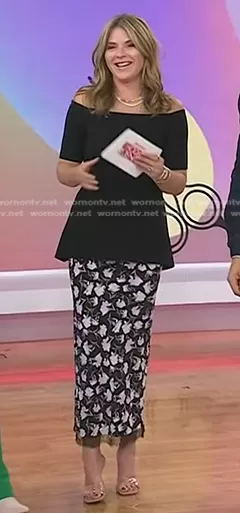 Jenna Bush Hager on Today on NBC was spotted wearing this black peplum top and floral skirt on Today on Apr 09 2024's episode. Jenna's Top is the Off-The-Shoulder Half-Sleeve Peplum Top by Lela Rose . Jenna's Skirt is the Castle Floral Midi Skirt by LoveShackFancy.
