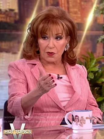 Joy Behar on The View on ABC was spotted wearing this pink linen blazer on The View on Apr 10 2024's episode. Joy's Blazer is the Khloe Ruched Sleeve Blazer by Cinq a Sept.