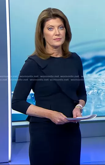 Norah O'Donnell on CBS Evening News on CBS was spotted wearing this navy ruffle trim dress on CBS Evening News on Apr 10 2024's episode. Norah's Dress is the Crew Neck Midi Dress by Teri Jon by Rickie Freeman .