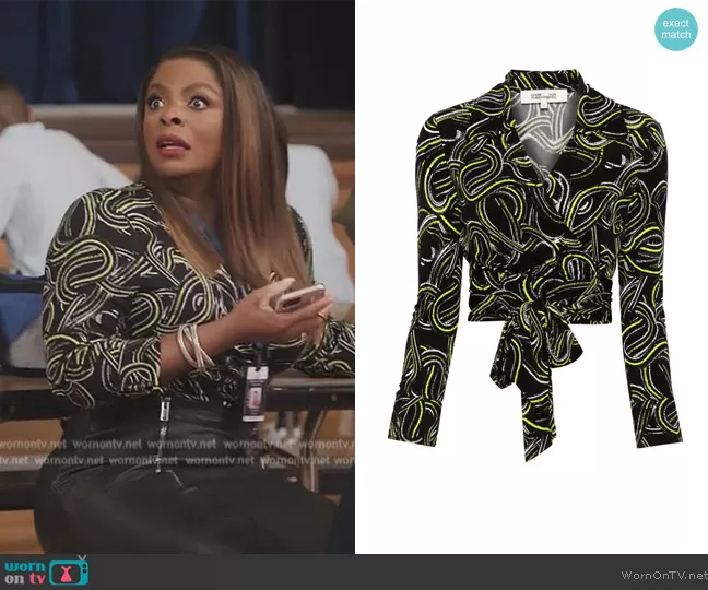 Ava Coleman (played by Janelle James) on Abbott Elementary on ABC was spotted wearing this printed wrap top and leather skirt on Abbott Elementary on episode 'Alex' (3x09) in Apr 2024. Ava's Top is the geometric cropped wrap top by DVF Diane von Furstenberg . Ava's Skirt is the Leather Skirt with Zips by Zara.