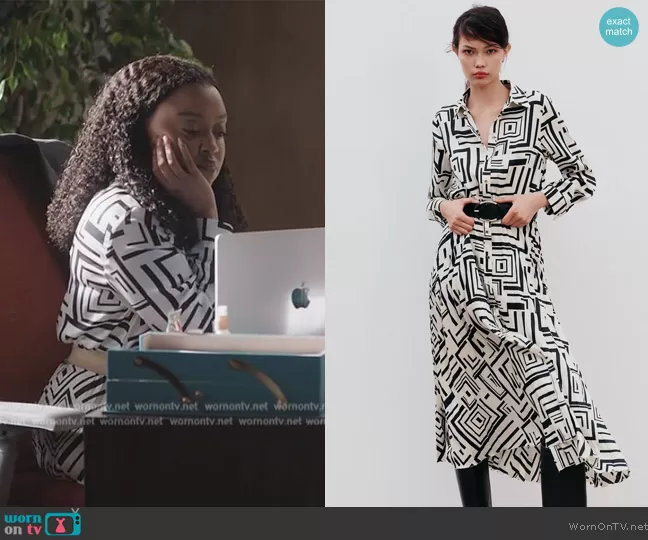 Janine Teagues (played by Quinta Brunson) on Abbott Elementary on ABC was spotted wearing this white geometric print shirtdress on Abbott Elementary on episode 'Alex' (3x09) in Apr 2024. Janine's Dress is the Printed Satin Effect Belted Dress by Zara.