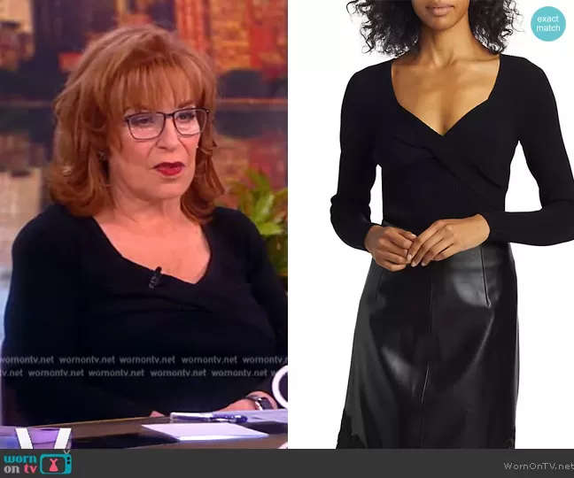 Joy Behar on The View on ABC was spotted wearing this black twist front sweater on The View on Jun 03 2025's episode. Joy's Sweater is the Twisted Rib-Knit Sweater by Elie Tahari.