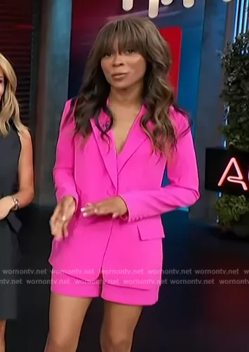 Zuri Hall on Access Hollywood on NBC was spotted wearing this pink blazer and shorts on Access Hollywood on Apr 11 2024's episode. Zuri's Blazer is the Single Breasted Blazer by Aqua . Zuri's Shorts is the Banded Shorts by Aqua.