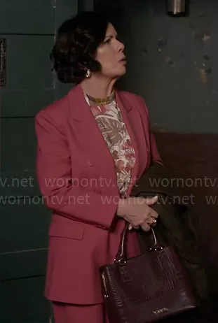 Margaret Wright (played by Marcia Gay Harden) on So Help Me Todd on CBS was spotted wearing this pink suit on So Help Me Todd on episode 'End on a High Note' (2x05) in Apr 2024. Margaret's Jacket is the Vibois Blazer by Maje . Margaret's Pants is the Pibois Pants by Maje . Margaret's Bag is the Limia Bordo Bag by Aldo.