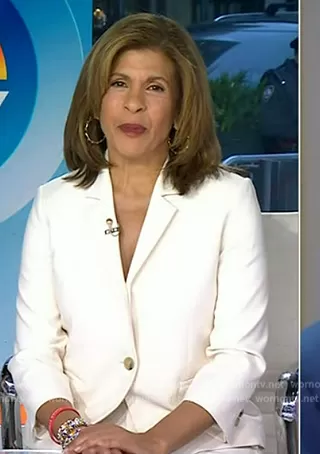 Hoda Kotb on Today on NBC was spotted wearing this white single button blazer and pants on Today on Apr 12 2024's episode. Hoda's Blazer is the Shrunken Blazer by Vince . Hoda's Pants is the Crepe Pintuck Wide-Leg Pants by Vince.