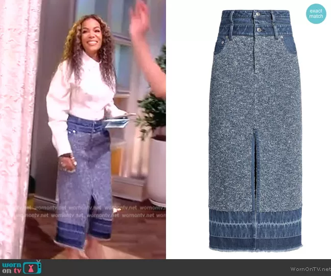 Sunny Hostin on The View on ABC was spotted wearing this denim skirt on The View on Apr 15 2024's episode. Sunny's Skirt is the Maddy Denim & Knit Midi Skirt by Simkhai.