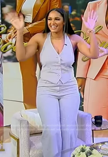 on Tamron Hall Show on ABC was spotted wearing this blue button vest and pants on Tamron Hall Show on Apr 15 2024's episode. 's Vest is the Arabella Cropped Vest by Veronica Beard . 's Pants is the Jude High-Rise Tailored Pants by Veronica Beard.