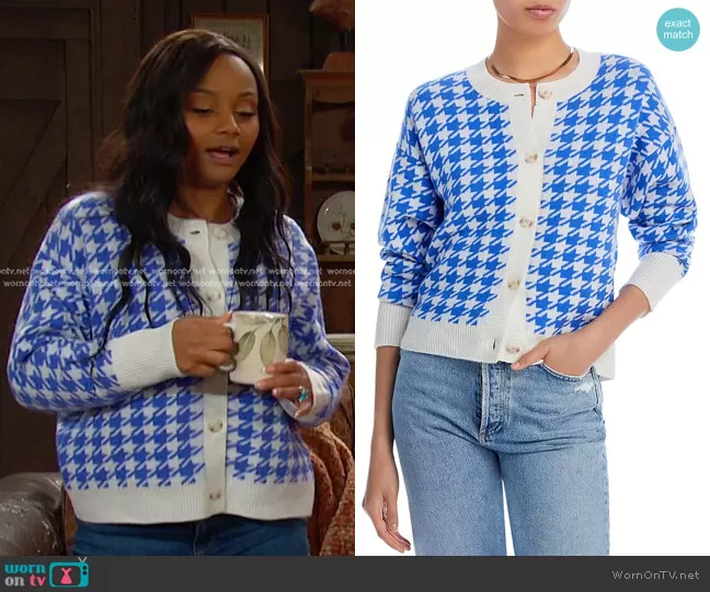 Chanel Dupree (played by Raven Bowens) on Days of our Lives on Peacock was spotted wearing this blue houndstooth cardigan on Days of our Lives on Apr 15 2024's episode. Chanel's Sweater is the Houndstooth Cashmere Cardigan by Aqua Cashmere . Chanel's Shoes is the Highmel Boot by Ugg.