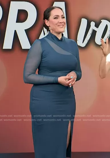 on Access Hollywood on NBC was spotted wearing this blue mesh dress on Access Hollywood on Apr 15 2024's episode. 's Dress is the Mesh Inset Long Sleeve Dress by Bebe.
