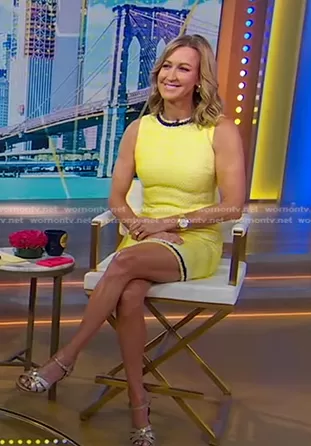 Lara Spencer on Good Morning America on ABC was spotted wearing this yellow tweed mini dress on Good Morning America on Apr 15 2024's episode. Lara's Dress is the Coley Metallic Tweed Mini Dress in Happy Yellow by Alice + Olivia . Lara's Shoes is the Tribute Metallic Leather Sandals in Platino by Saint Laurent.