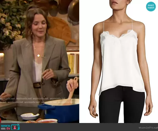 Drew Barrymore on The Drew Barrymore Show on CBS was spotted wearing this white lace trim cami and blazer on The Drew Barrymore Show on Apr 15 2024's episode. Drew's Top is the The Racer Top by Cami NYC . Drew's Blazer is the Husband Plaid Wool Blazer by TWP . Drew's Pants is the Cinched Wide-Leg Wool Trousers by Chloe.