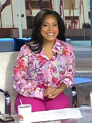 Sheinelle Jones on Today on NBC was spotted wearing this pink floral print blouse on Today on Apr 15 2024's episode. Sheinelle's Top is the Floral Print Oversize Shirt by Endless Rose . Sheinelle's Earrings is the Ellie Gold Stud Earrings in Iridescent Drusy by Kendra Scott.