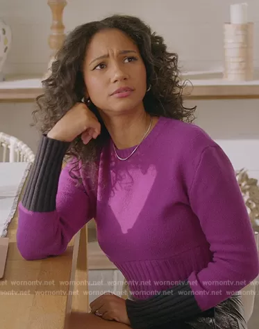 Layla Keating (played by Greta Onieogou) on All American on CWTV was spotted wearing this purple contrast cuffs sweater on All American on episode 'Business Is Business' (6x03) in Apr 2024. Layla's Sweater is the Two-toned cropped jumper by Plan C.