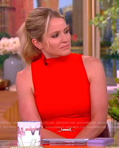 Sara Haines on The View on ABC was spotted wearing this orange turtleneck dress on The View on episode 'Business Is Business' (6x03) in Jun 2024. Sara's Dress is the 2022 Resort Collection by Ralph Lauren.